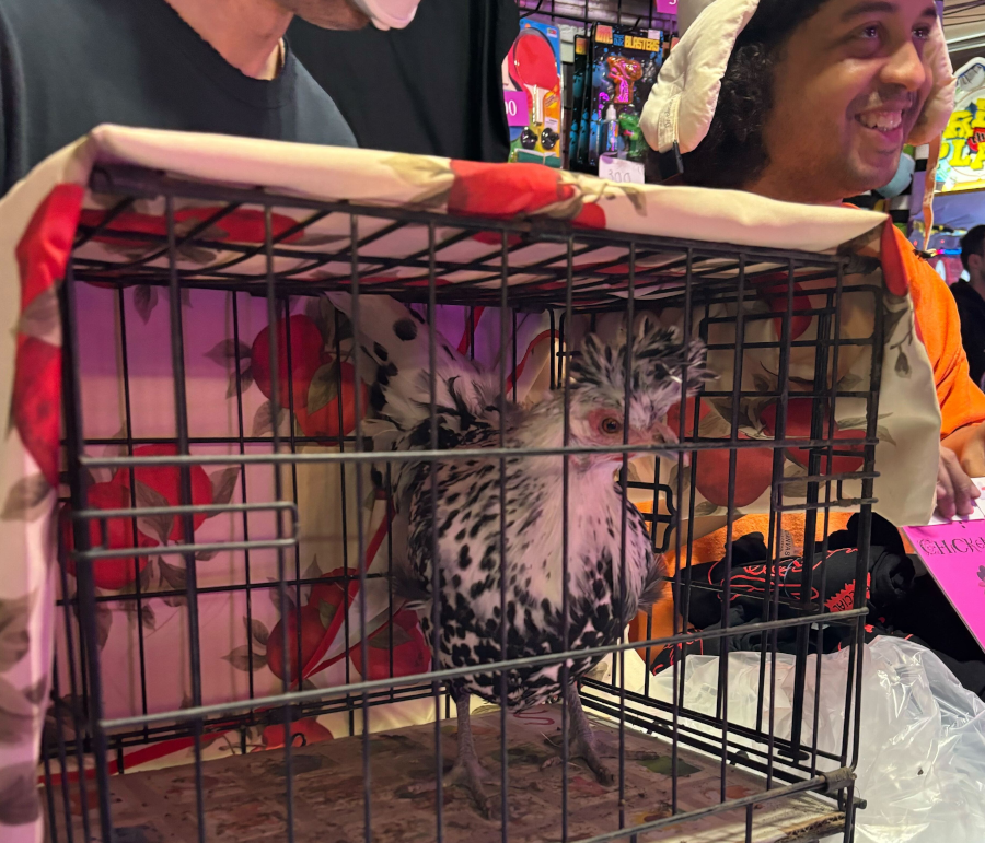 Scrapeboard was joined by Zebra, an urban farm chicken, for a night of arcade games, custom prizes, vegan nuggets, and chicken poop bingo at Chinatown Fair in NYC. Here's a pic from Steph of Zebra at the start of bingo 🐔